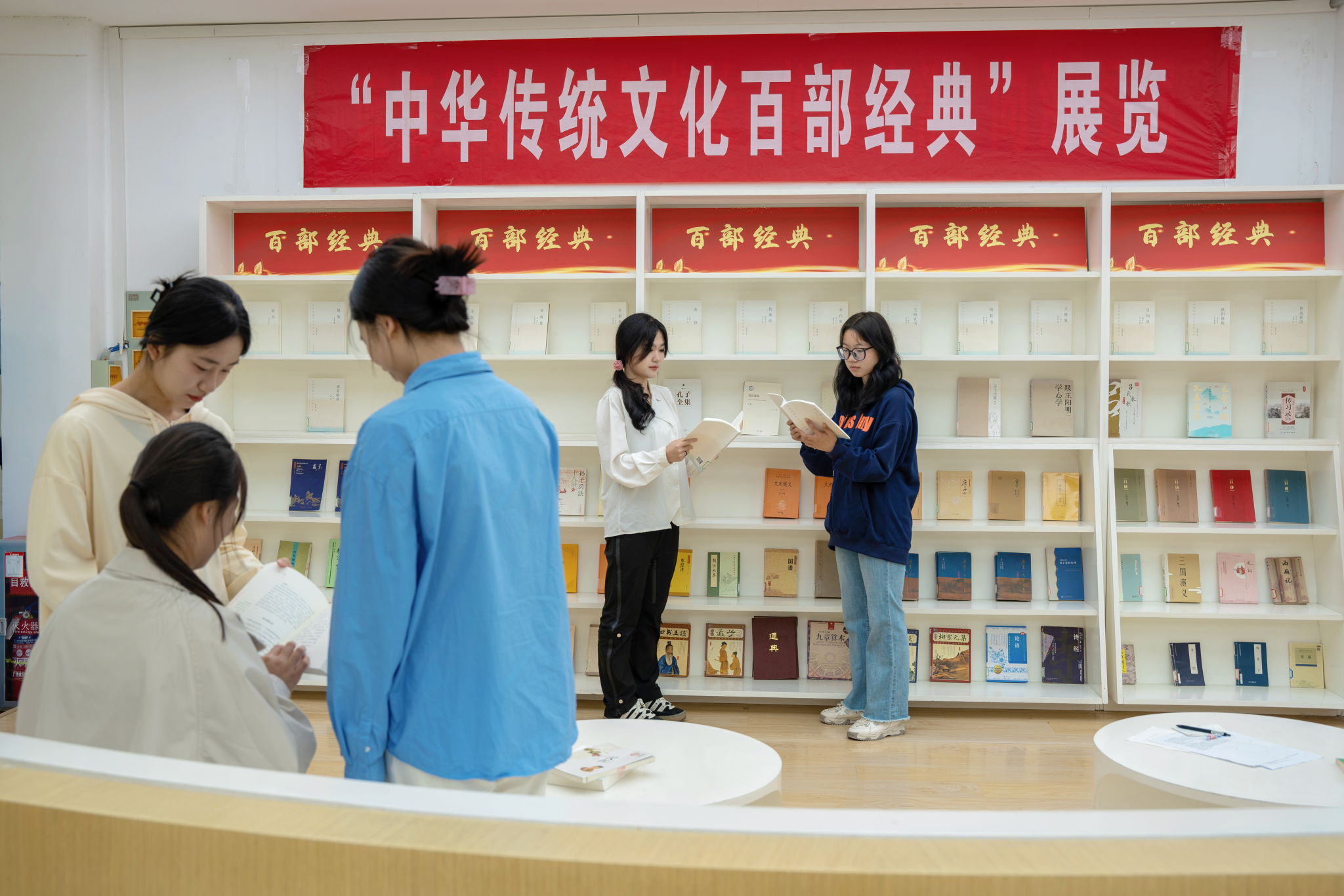 学校在图书馆大厅设立“中华传统文化百部经典”书展专区。在这里,展出了由国家图书馆组织编纂的《中华传统文化百部经典》70部经典书籍。读者可根据自己的阅读需求自行选择相应的图书借阅。在经典书籍中,他们探寻真知、启迪智慧、笃信笃行,感受中华传统文化的深厚底蕴,共同传承并发扬中华优秀传统文化。