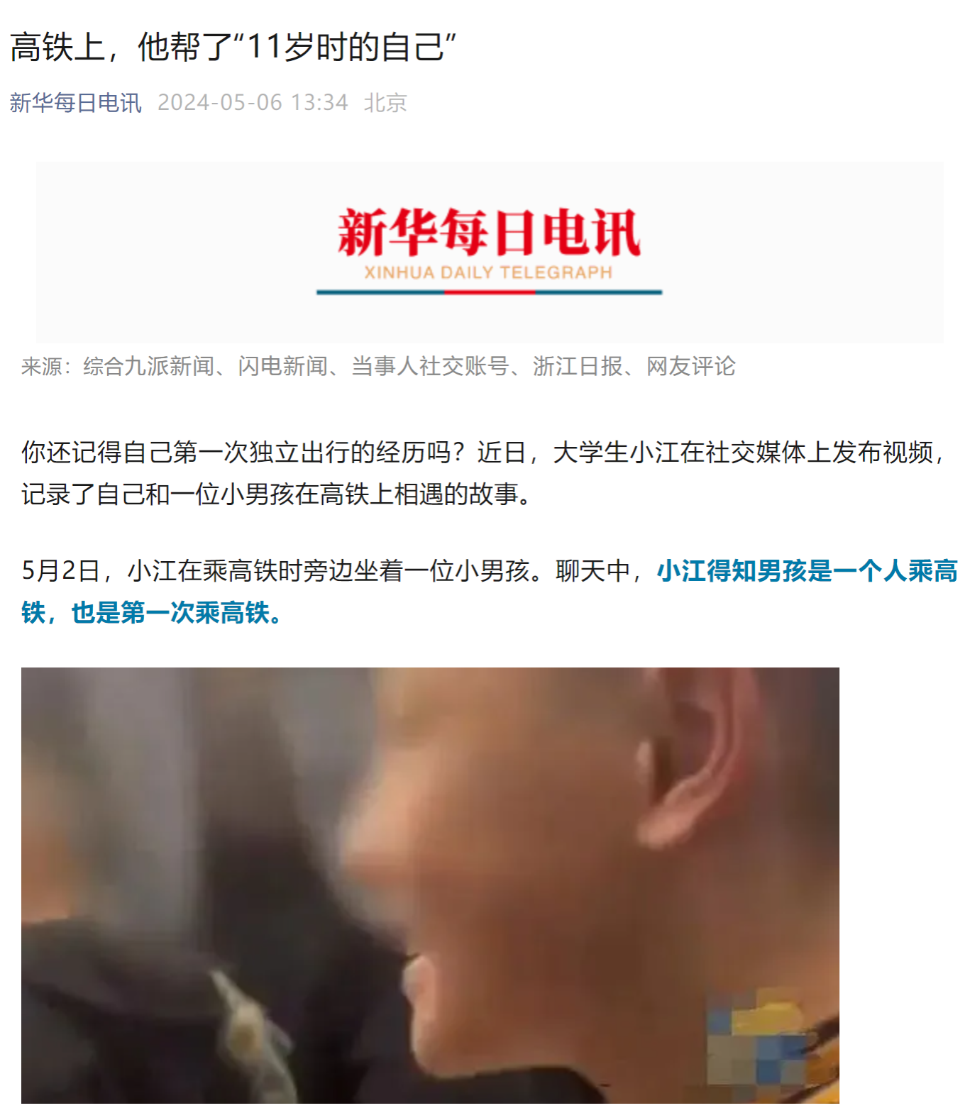 你还记得自己第一次独立出行的经历吗?近日,大学生小江在社交媒体上发布视频,记录了自己和一位小男孩在高铁上相遇的故事。