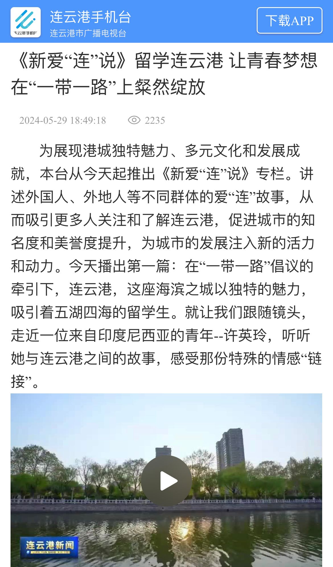 为展现港城独特魅力、多元文化和发展成就,本台从今天起推出《新爱“连”说》专栏。讲述外国人、外地人等不同群体的爱“连”故事,从而吸引更多人关注和了解连云港,促进城市的知名度和美誉度提升,为城市的发展注入新的活力和动力。今天播出第一篇:在“一带一路”倡议的牵引下,连云港,这座海滨之城以独特的魅力,吸引着五湖四海的留学生。就让我们跟随镜头,走近一位来自印度尼西亚的青年--许英玲,听听她与连云港之间的故事,感受那份特殊的情感“链接”。