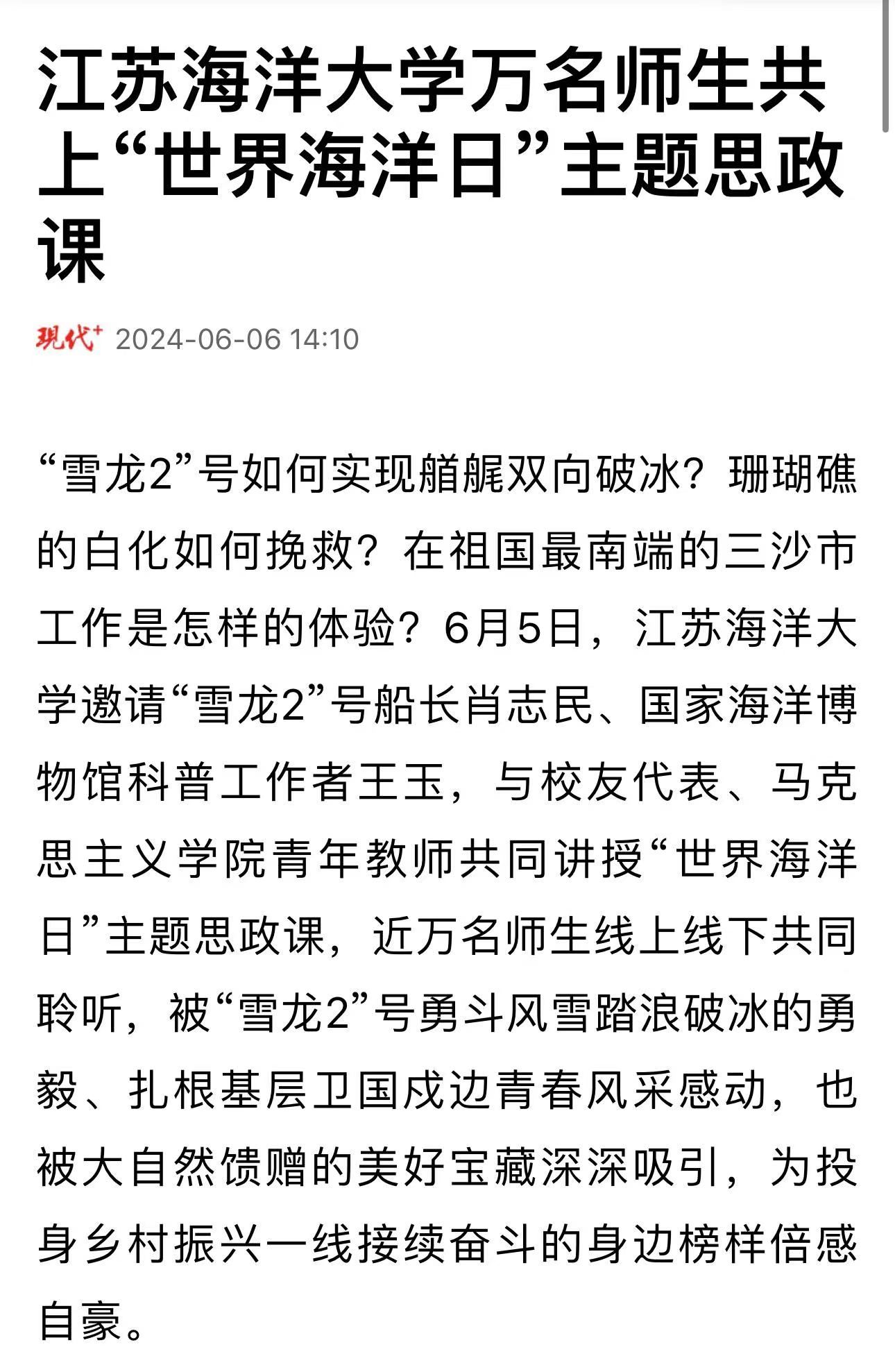 “雪龙2”号如何实现艏艉双向破冰?珊瑚礁的白化如何挽救?在祖国最南端的三沙市工作是怎样的体验?6月5日,江苏海洋大学邀请“雪龙2”号船长肖志民、国家海洋博物馆科普工作者王玉,与校友代表、马克思主义学院青年教师共同讲授“世界海洋日”主题思政课,近万名师生线上线下共同聆听,被“雪龙2”号勇斗风雪踏浪破冰的勇毅、扎根基层卫国戍边青春风采感动,也被大自然馈赠的美好宝藏深深吸引,为投身乡村振兴一线接续奋斗的身边榜样倍感自豪。