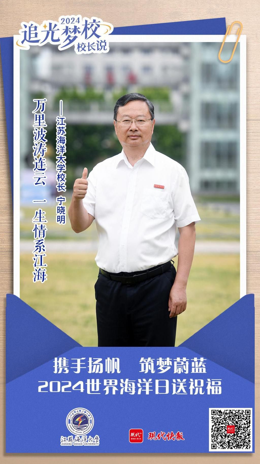 在这个特别的日子里,江苏海洋大学校长宁晓明做客现代快报" 追光梦校 · 2024 校长说 ",向 " 海宝 " 们致以美好的祝福。