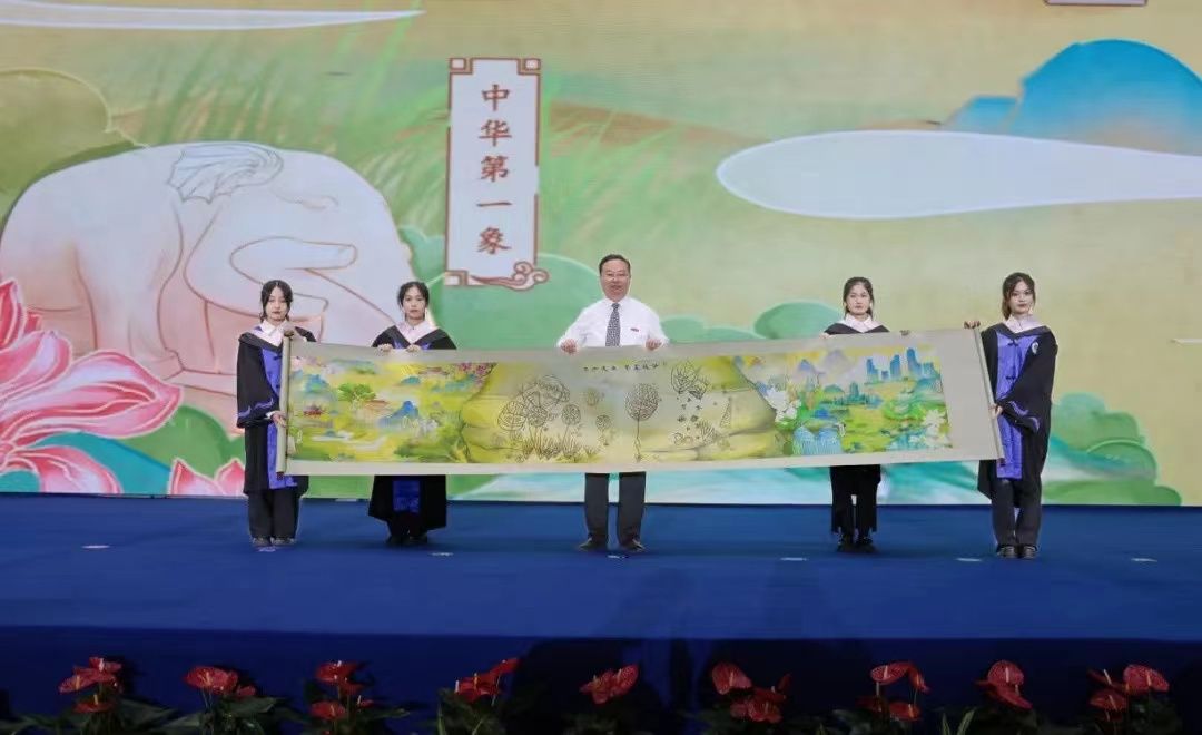 校长宁晓明接收毕业生代表向学校赠送的纪念品。