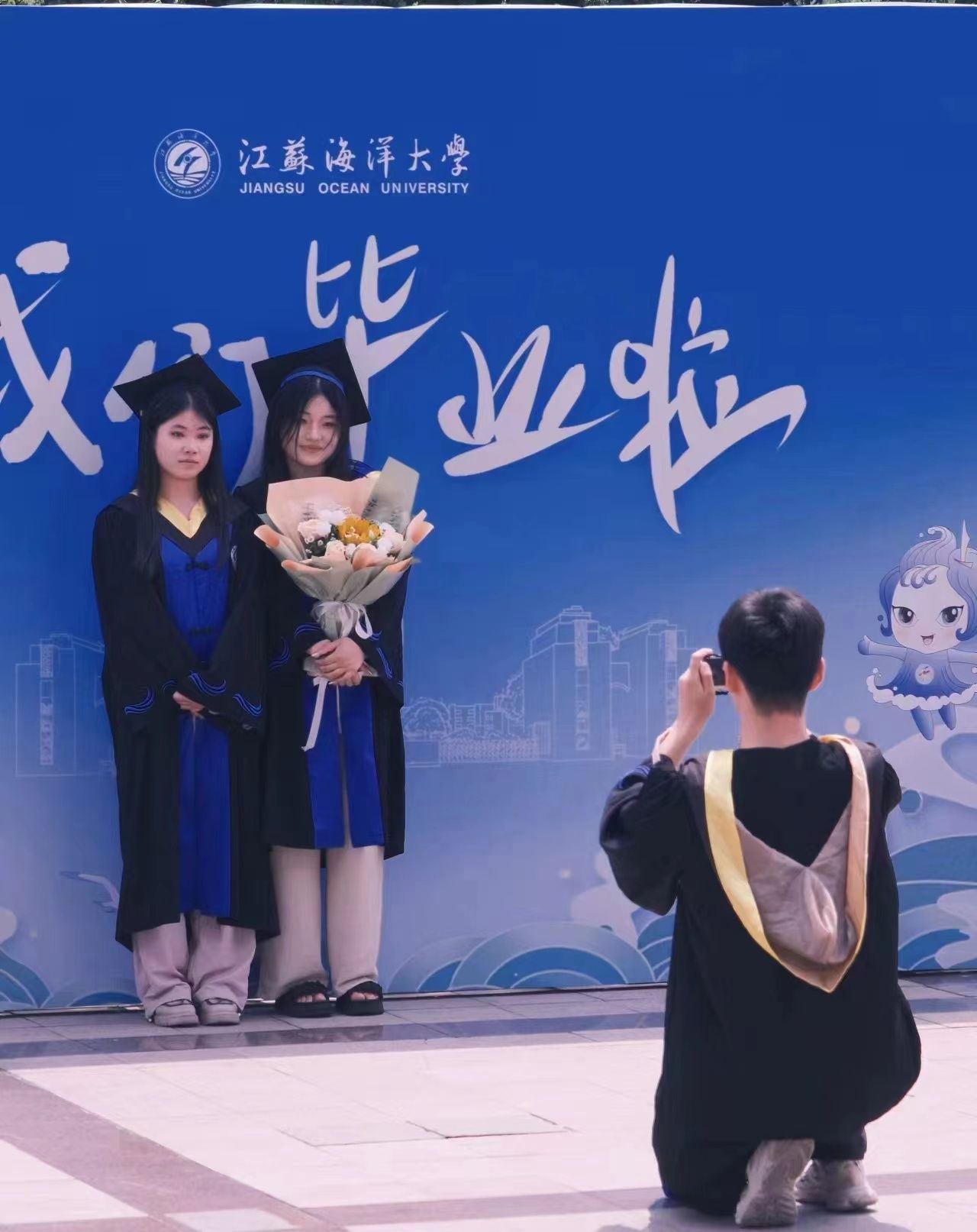 典礼上,校党委书记许峰为2024年度省级优秀毕业生代表颁奖,并送上江海大吉祥物“山娃”“海妮”。他引导毕业生们要传承江海大人的精神,续写江海大人的篇章;要胸怀壮志与豪情,在建设海洋强国的新征程上扬帆起航、劈波斩浪;要坚定做服务国家发展的奋斗者,做助力民族复兴的圆梦人。