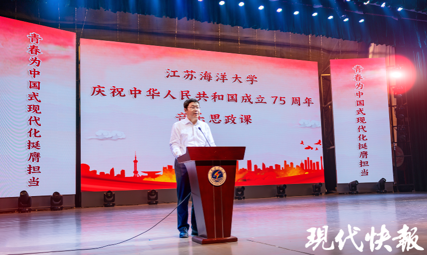 七十五载砥砺奋进,激扬青春谱写华章。9月27日晚,江苏海洋大学“庆祝中华人民共和国成立75周年音乐思政课”在苍梧校区大礼堂举行。校党委书记许峰,副校长金芙蓉、朱国军,相关部门、学院负责人,以及1400余名师生齐聚现场,同上一堂音乐思政大课,聆听经典名曲,一起感受文化艺术魅力与深厚家国情怀的交融碰撞。本次思政课以线下观看与线上直播相结合的方式进行。