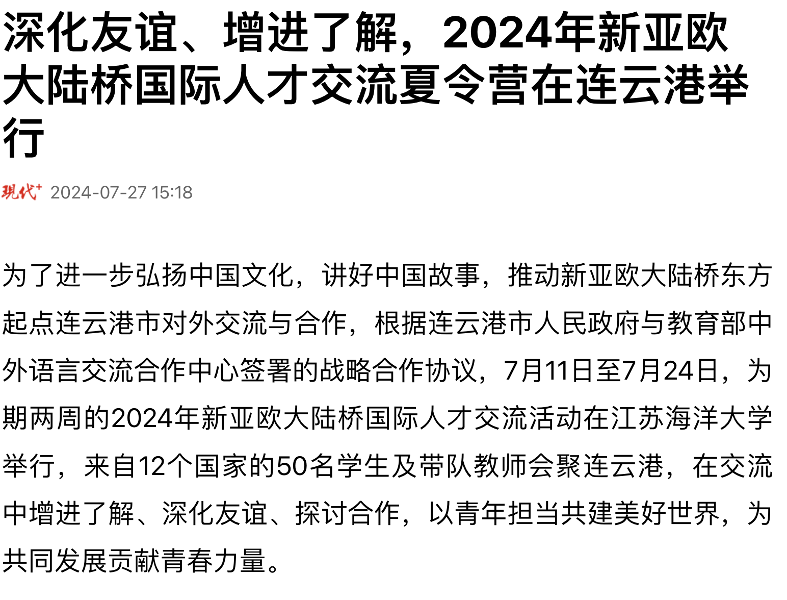 为了进一步弘扬中国文化,讲好中国故事,推动新亚欧大陆桥东方起点连云港市对外交流与合作,根据连云港市人民政府与教育部中外语言交流合作中心签署的战略合作协议,7月11日至7月24日,为期两周的2024年新亚欧大陆桥国际人才交流活动在江苏海洋大学举行,来自12个国家的50名学生及带队教师会聚连云港,在交流中增进了解、深化友谊、探讨合作,以青年担当共建美好世界,为共同发展贡献青春力量。
