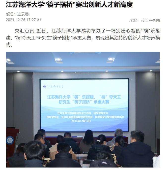 近日,江苏海洋大学成功举办了一场别出心裁的“‘筷’乐搭建,‘桥’夺天工”研究生“筷子搭桥”承重大赛,展现出其独特的创新人才培养模式。