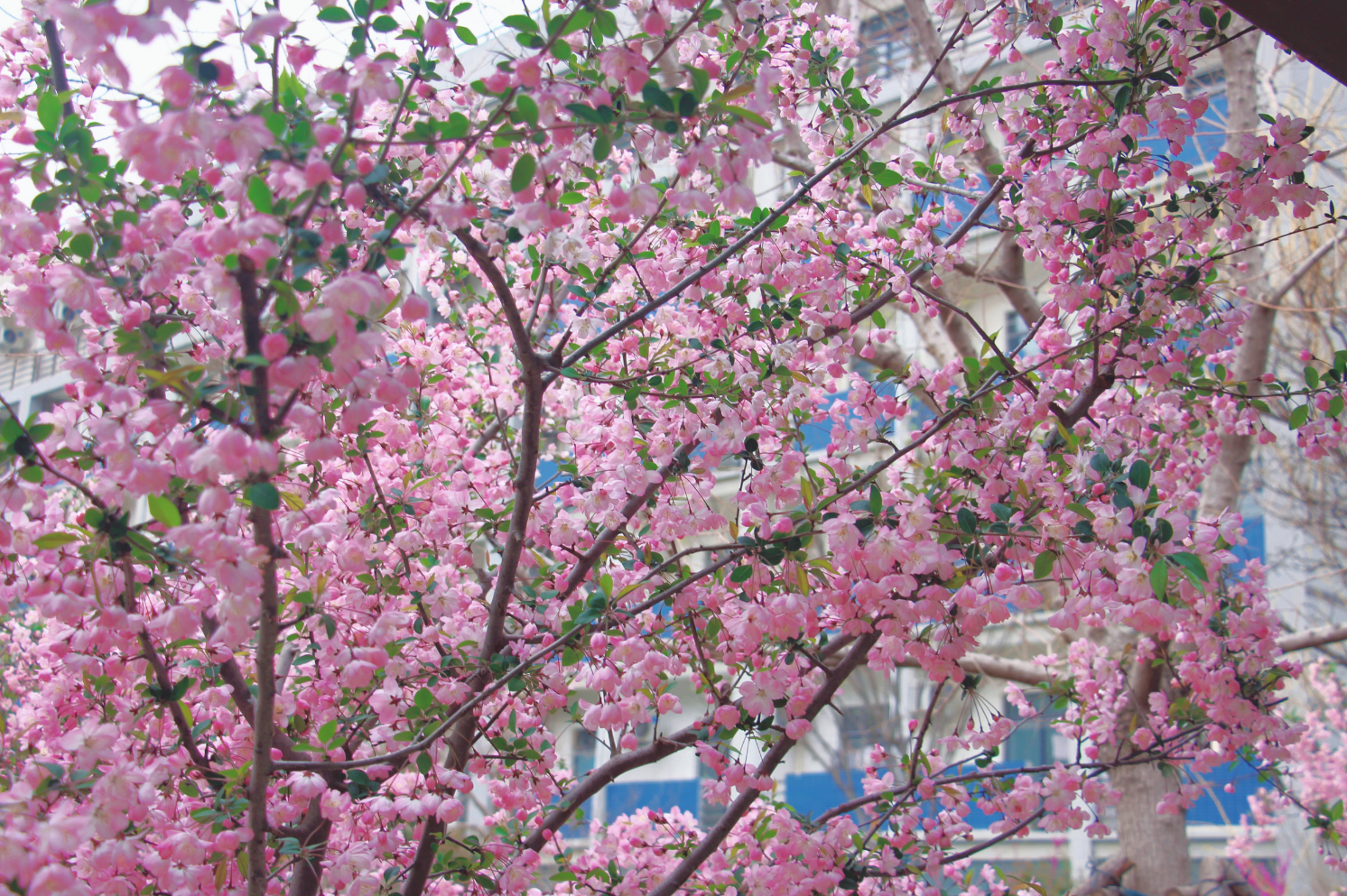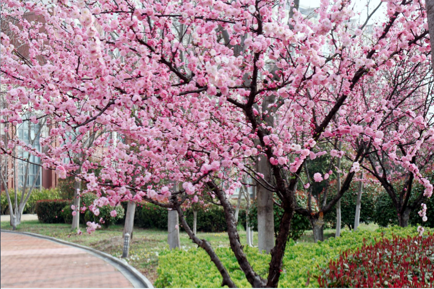 校园里花枝吐艳,粉瓣如霞