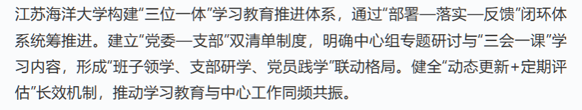 江苏海洋大学构建“三位一体”学习教育推进体系,通过“部署—落实—反馈”闭环体系统筹推进。建立“党委—支部”双清单制度,明确中心组专题研讨与“三会一课”学习内容,形成“班子领学、支部研学、党员践学”联动格局。健全“动态更新+定期评估”长效机制,推动学习教育与中心工作同频共振。