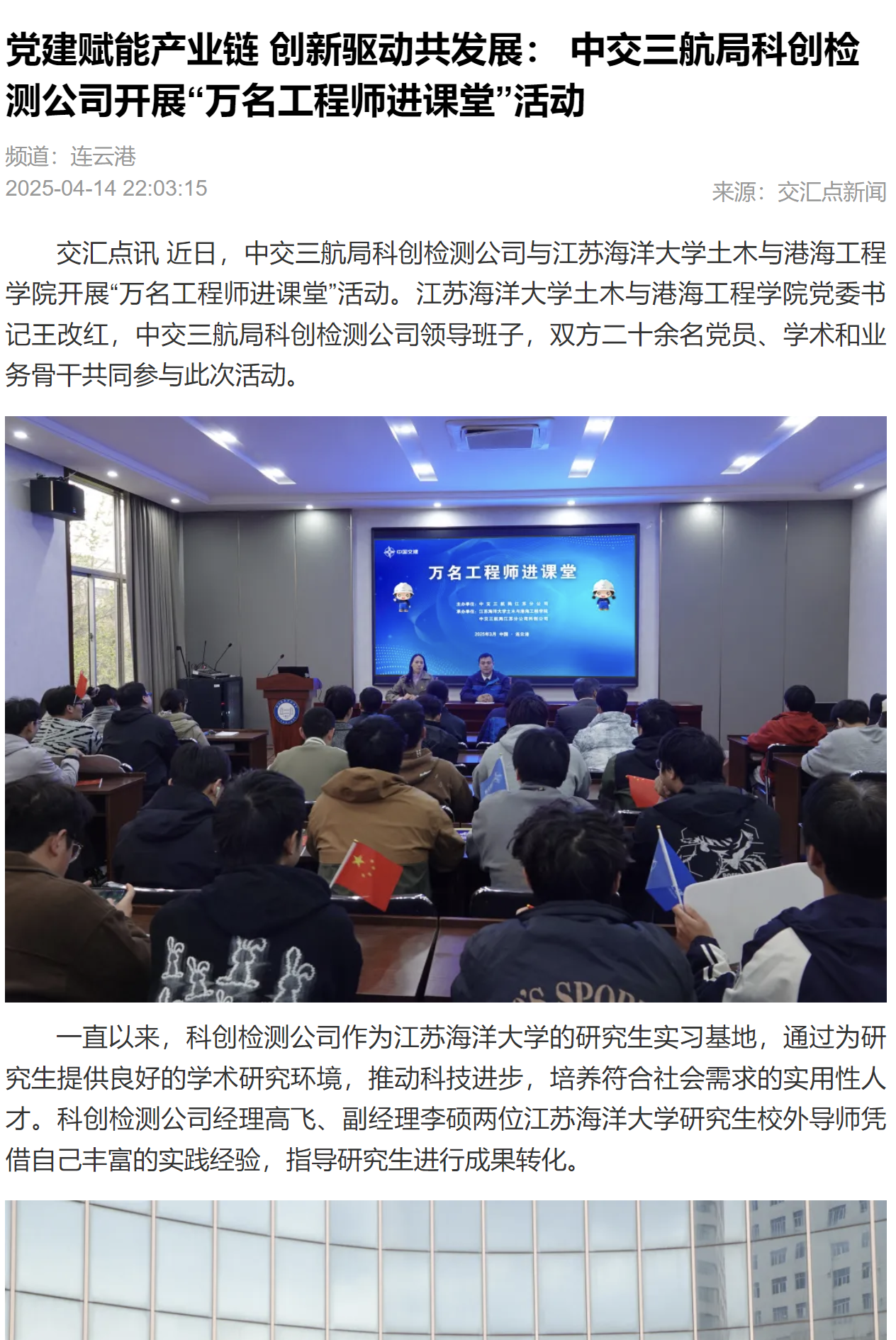 交汇点讯近日,中交三航局科创检测公司与江苏海洋大学土木与港海工程学院开展“万名工程师进课堂”活动。江苏海洋大学土木与港海工程学院党委书记王改红,中交三航局科创检测公司领导班子,双方二十余名党员、学术和业务骨干共同参与此次活动。