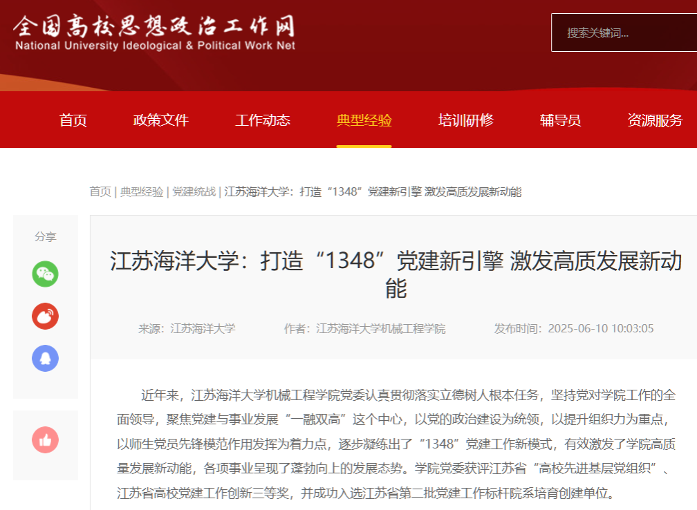 近年来,江苏海洋大学机械工程学院党委认真贯彻落实立德树人根本任务,坚持党对学院工作的全面领导,聚焦党建与事业发展“一融双高”这个中心,以党的政治建设为统领,以提升组织力为重点,以师生党员先锋模范作用发挥为着力点,逐步凝练出了“1348”党建工作新模式,有效激发了学院高质量发展新动能,各项事业呈现了蓬勃向上的发展态势。学院党委获评江苏省“高校先进基层党组织”、江苏省高校党建工作创新三等奖,并成功入选江苏省第二批党建工作标杆院系培育创建单位。
