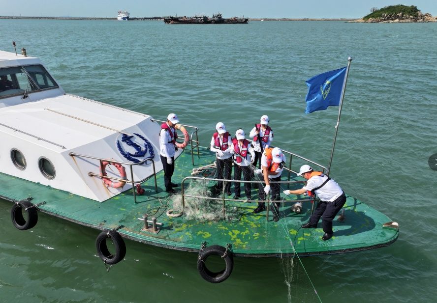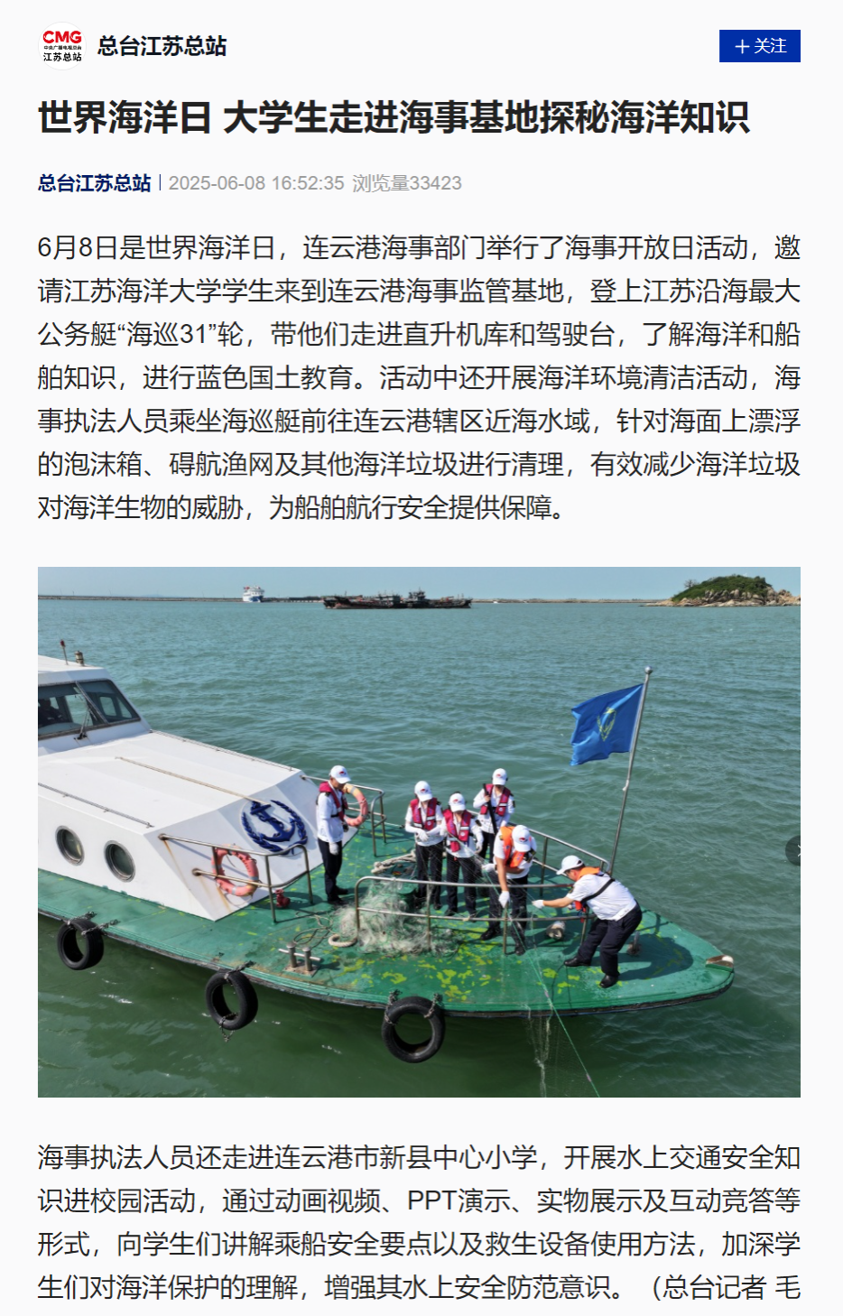 6月8日是世界海洋日,连云港海事部门举行了海事开放日活动,邀请江苏海洋大学学生来到连云港海事监管基地,登上江苏沿海最大公务艇“海巡31”轮,带他们走进直升机库和驾驶台,了解海洋和船舶知识,进行蓝色国土教育。活动中还开展海洋环境清洁活动,海事执法人员乘坐海巡艇前往连云港辖区近海水域,针对海面上漂浮的泡沫箱、碍航渔网及其他海洋垃圾进行清理,有效减少海洋垃圾对海洋生物的威胁,为船舶航行安全提供保障。