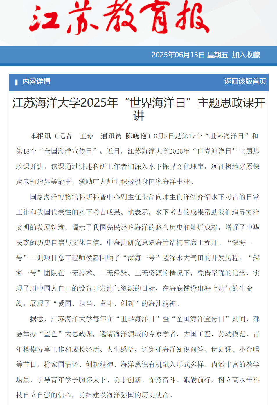6月8日是第17个“世界海洋日”和第18个“全国海洋宣传日”。近日,江苏海洋大学2025年“世界海洋日”主题思政课开讲,该课通过讲述科研工作者们深入水下探寻文化瑰宝,远征极地冰原探索未知边界等故事,激励广大师生积极投身国家海洋事业。