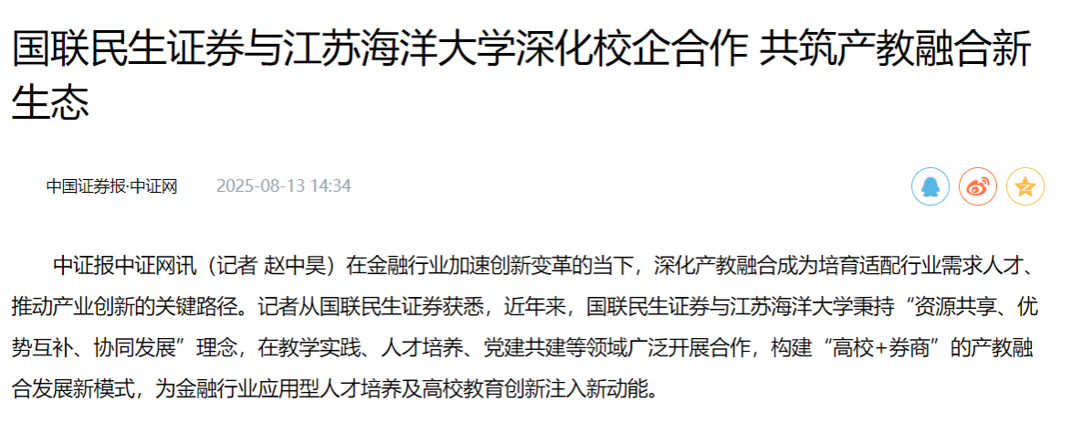 校企合作的深度推进,离不开坚实的平台支撑与长效的机制保障。国联民生证券与江苏海洋大学的合作,从搭建精准对接的平台、构建持续运转的机制起步,逐步筑牢协同发展的根基。