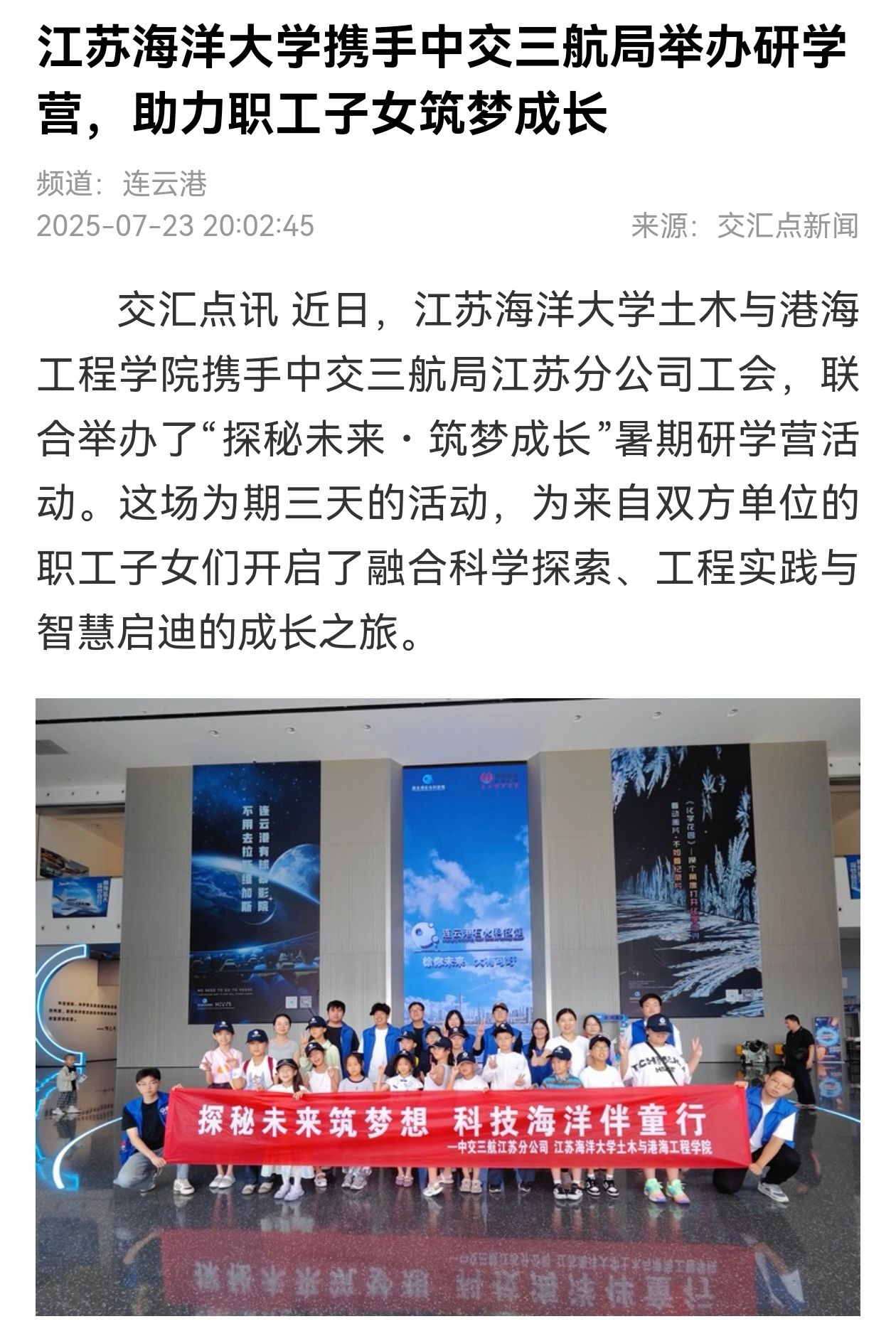 近日,江苏海洋大学土木与港海工程学院携手中交三航局江苏分公司工会,联合举办了“探秘未来・筑梦成长”暑期研学营活动。这场为期三天的活动,为来自双方单位的职工子女们开启了融合科学探索、工程实践与智慧启迪的成长之旅。
