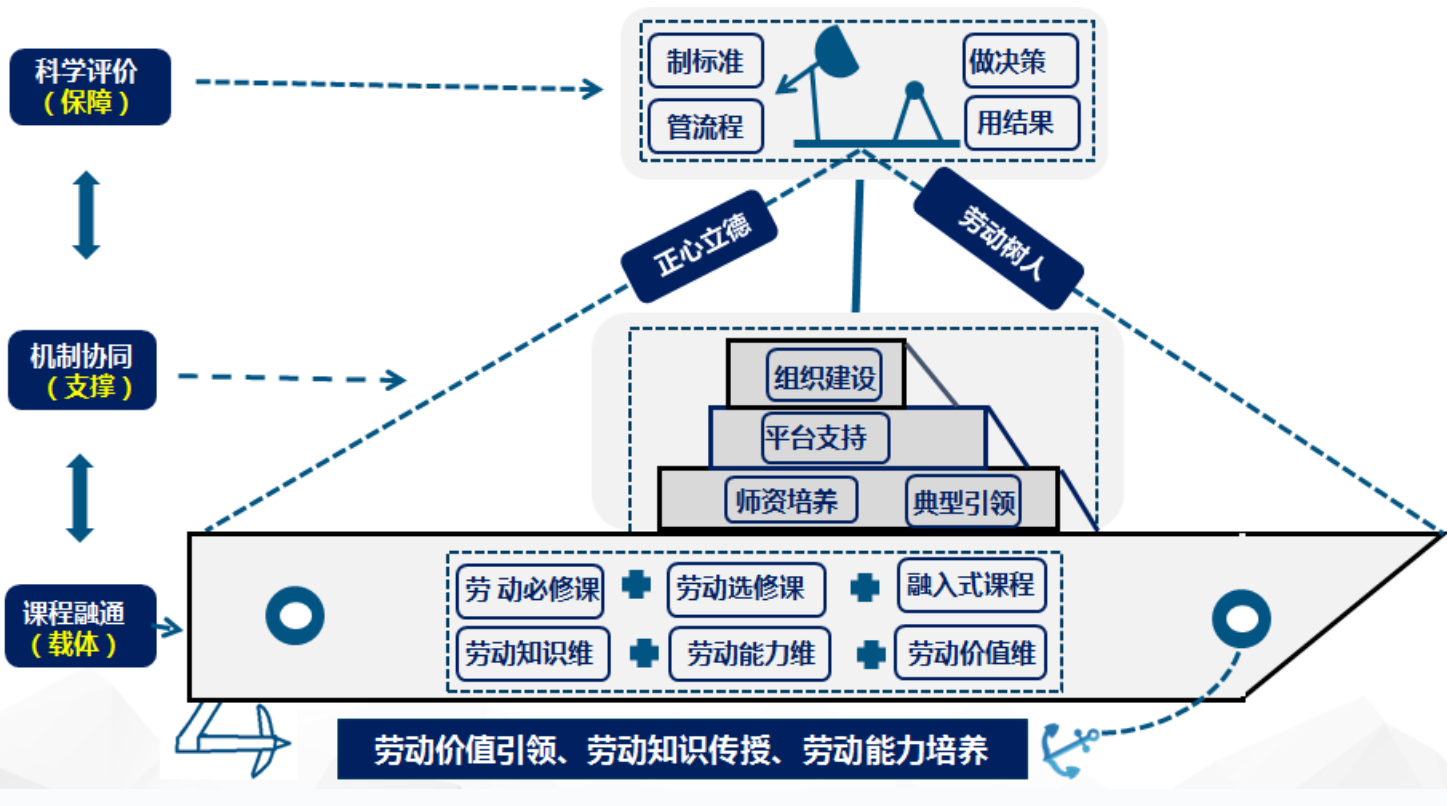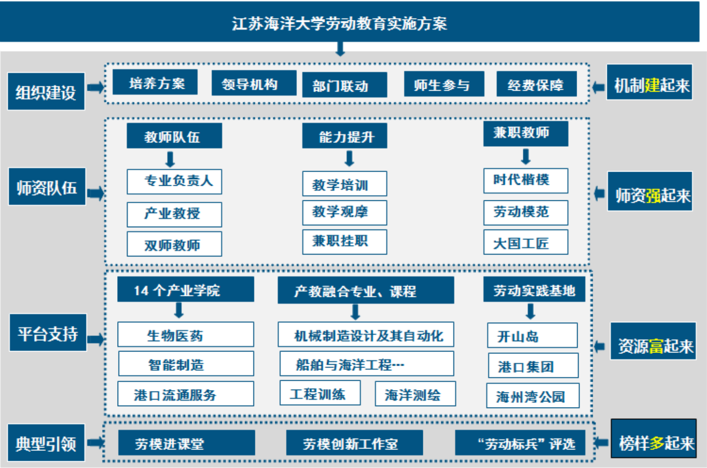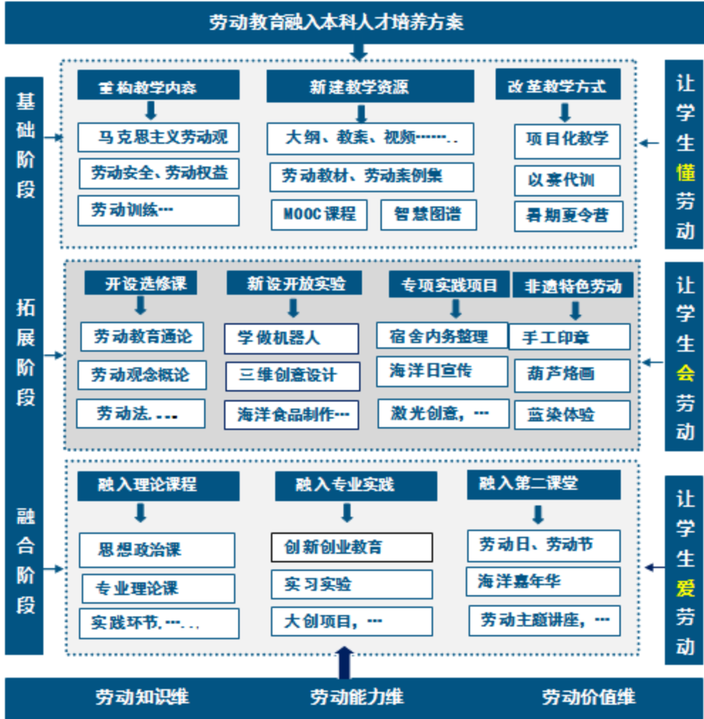 江苏海洋大学自创办之初,即定位为苏北基层一线培育应用型人才,始终重视劳动教育。一直鼓励学生扎根基层,做到“下得去”“留得住”“干得好”。经过多年探索与实践,江苏海洋大学形成了“正心立德、劳动树人”的理念,构建了“机制协同、课程融通、科学评价”三位一体的应用型高校劳动教育培养体系。将教育逻辑、实践逻辑与技术逻辑的深度融合,以价值观为魂、能力培养为骨、机制创新为脉,实现劳动价值引领、劳动知识传授、劳动能力培养有机统一。
