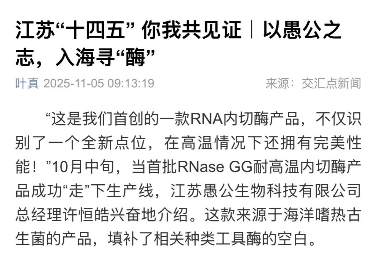 “这是我们首创的一款RNA内切酶产品,不仅识别了一个全新点位,在高温情况下还拥有完美性能!”10月中旬,当首批RNase GG耐高温内切酶产品成功“走”下生产线,江苏愚公生物科技有限公司总经理许恒皓兴奋地介绍。这款来源于海洋嗜热古生菌的产品,填补了相关种类工具酶的空白。