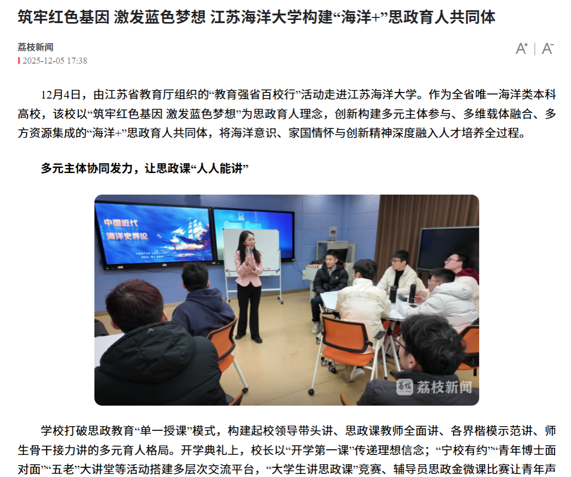 12月4日,由江苏省教育厅组织的“教育强省百校行”活动走进江苏海洋大学。作为全省唯一海洋类本科高校,该校以“筑牢红色基因 激发蓝色梦想”为思政育人理念,创新构建多元主体参与、多维载体融合、多方资源集成的“海洋+”思政育人共同体,将海洋意识、家国情怀与创新精神深度融入人才培养全过程。
