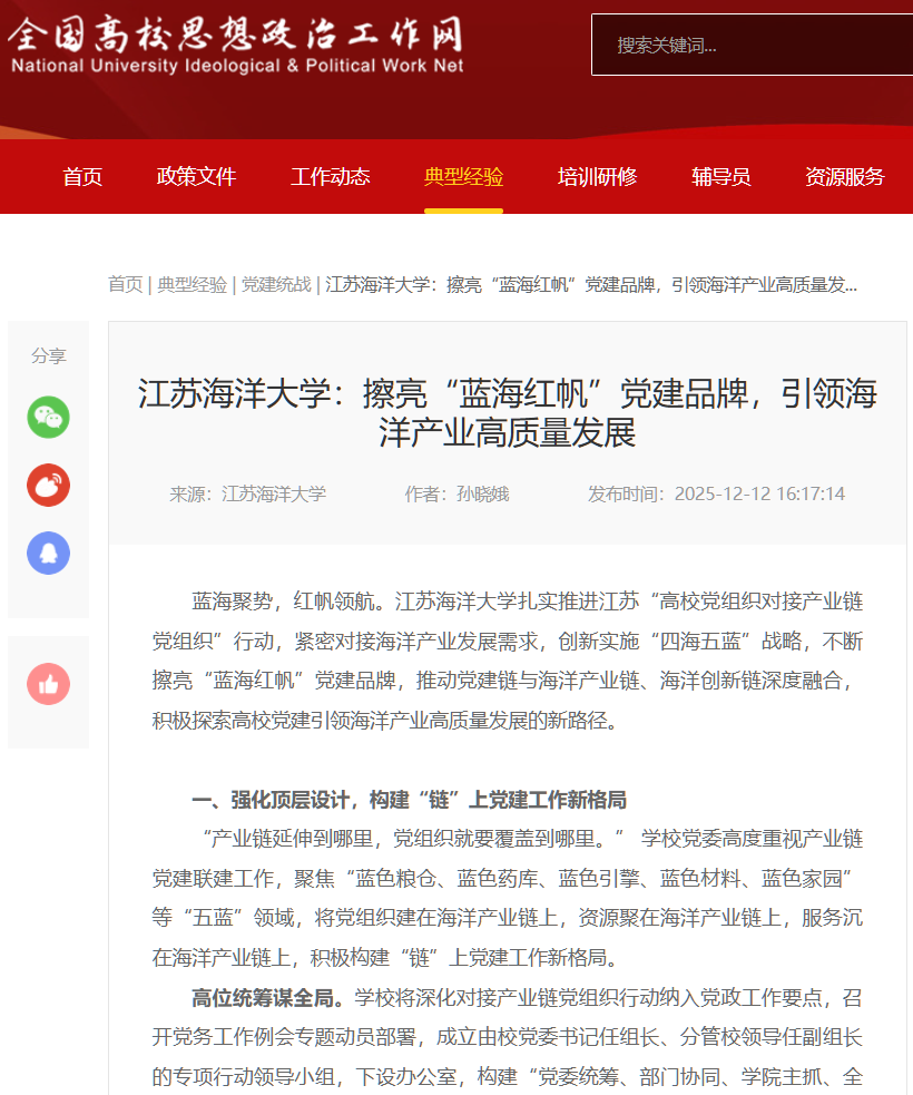 蓝海聚势,红帆领航。江苏海洋大学扎实推进江苏“高校党组织对接产业链党组织”行动,紧密对接海洋产业发展需求,创新实施“四海五蓝”战略,不断擦亮“蓝海红帆”党建品牌,推动党建链与海洋产业链、海洋创新链深度融合,积极探索高校党建引领海洋产业高质量发展的新路径。