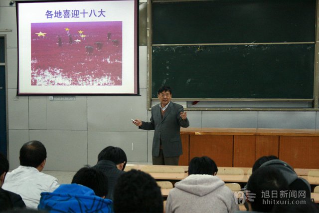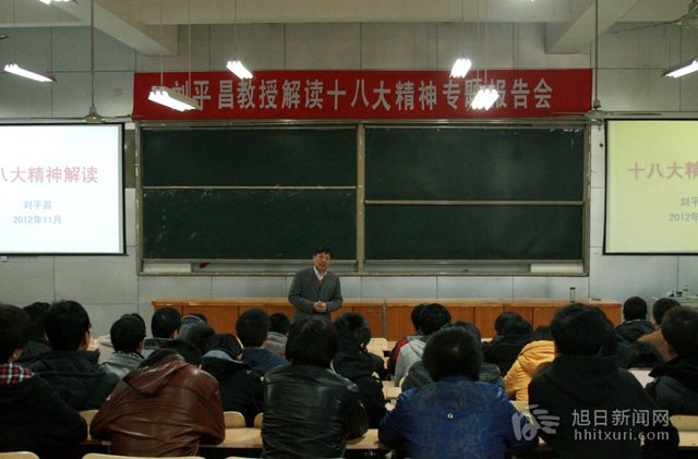 近日,刘平昌教授在东港学院D2---201多媒体教室为该院师生作解读“十八大”精神专题报告会。