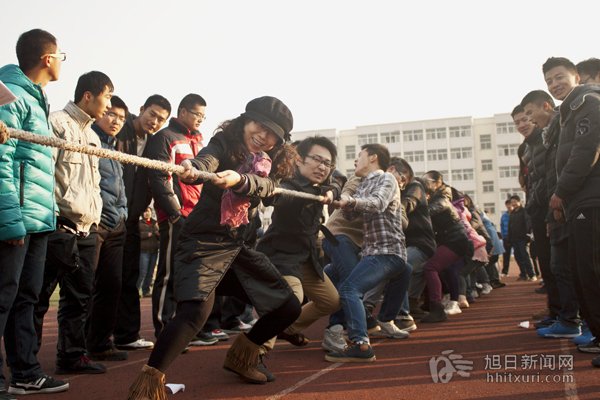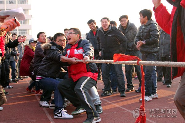 12月8日下午2时30分,运动场上人声鼎沸,热闹非凡,入口早已被前来观看的同学堵得水泄不通。国际学院拔河比赛正热火朝天地进行。参赛的同学都双手紧握麻绳,一起用力,脸憋得通红,也丝毫不放松,给力的拉拉队也在一旁卯足了劲:“加油!加油!”各班班主任也从家中赶来与学生一起参加比赛。