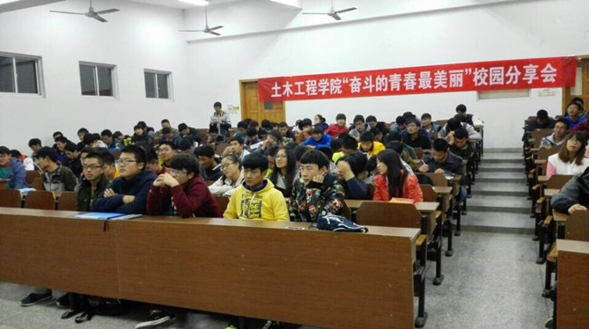 11月13日晚7点,土木工程学院在文通楼A楼202教室举行了“奋斗的青春最美丽”校园分享会。此次分享会邀请了张琦、朱旭、王东阳、王慧四名青春故事主讲人,与2014级学生分享他们在大学校园里的成长经历和奋斗故事。