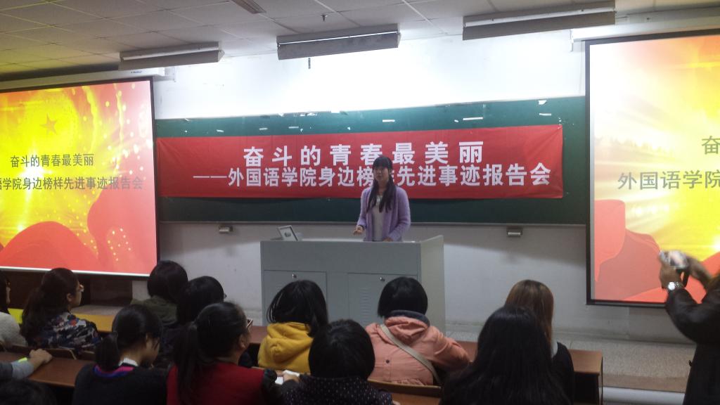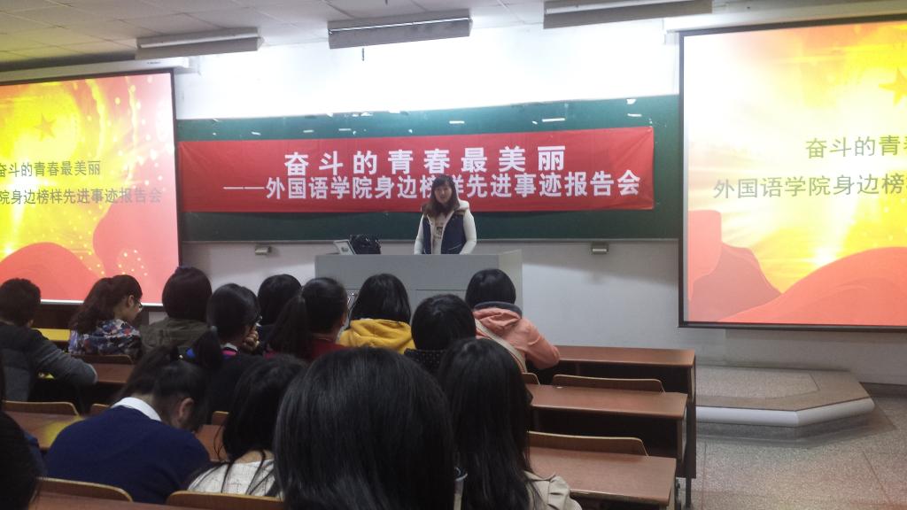 新生入学教育是整个大学教育的起点,是成功大学教育和良好学生工作的开端和基础,为了帮助2014级新生顺利完成从中学到大学的角色适应与转变,科学树立人生目标,认真规划大学生活, 2014年10月29日下午,外国语学院举办了“奋斗的青春最美丽”励志教育主题报告会。报告会邀请了多位获得国家奖学金、国家励志奖学金、综合素质发展全面的高年级同学为新生讲述他们青春路上不断奋斗的故事,分享他们大学校园里的成长经历。外国语学院领导、辅导员、班主任和全体新生参加了会议。