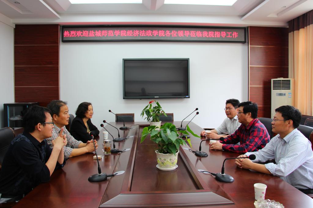 5月22日上午,盐城师范学院经济法政学院院长刘德林、盐城师范学院党校副校长程宏如一行四人来我校法学院开展工作交流活动。教学质量管理处处长杨雪英、法学院党委书记朱国良和学院其他党政领导参加了交流会。