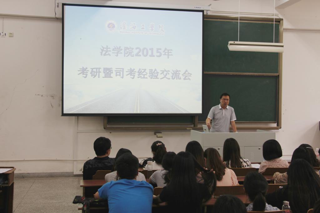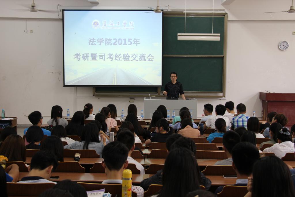 6月1日下午,法学院在A104教室举办2015年考研暨司考经验交流会。法学院党委副书记黄金虎、副院长魏范青和法学院部分考取研究生、通过司法考试的优秀学生代表出席会议。法学院2012级全体同学和部分大一、大二学生参加了交流会。交流会由黄金虎主持。