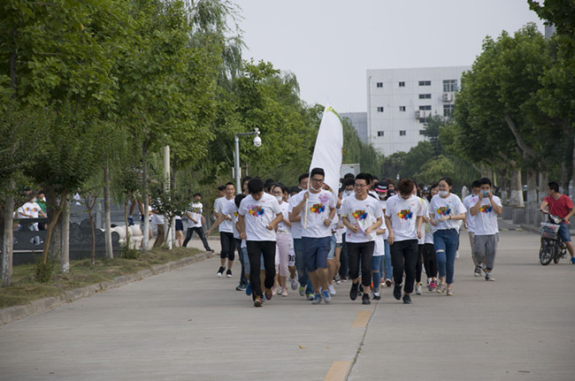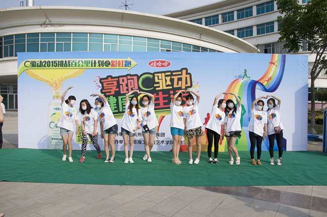 准备时,同学们就开始摩拳擦掌,将自己的T裇用彩笔勾勒出别致的图案,还有同学在自己的背后印了两个大大的手印。好几个同学早早地站在起跑线上,迫切得想要跑起来。短暂的准备之后,大家都站到了起跑线上,大四的学长扛着大旗,站在最前面,学弟学妹们都在学长的身后排成四列纵队。“啪”,一声枪响,大家迅速起跑,紧紧跟随者学长,绕学校一圈。主办方将绕学校一周的路分为六段,五个彩色站,依次为起点-绿-紫-蓝-黄 -红 -终点,每一个颜色的彩色站的跑道外的工作人员会都向参与者撒播彩粉,以示祝福。到达终点时同学们将面临五色彩粉的洗礼。不多时,就有同学跑到了终点,天空中五色彩粉飘散,经过的同学瞬间被蒙上了彩色的“圣衣”。被撒到的同学并没有停下脚步,而是一路向前,扑到巨大的签名板上留下自己的手印和签名。