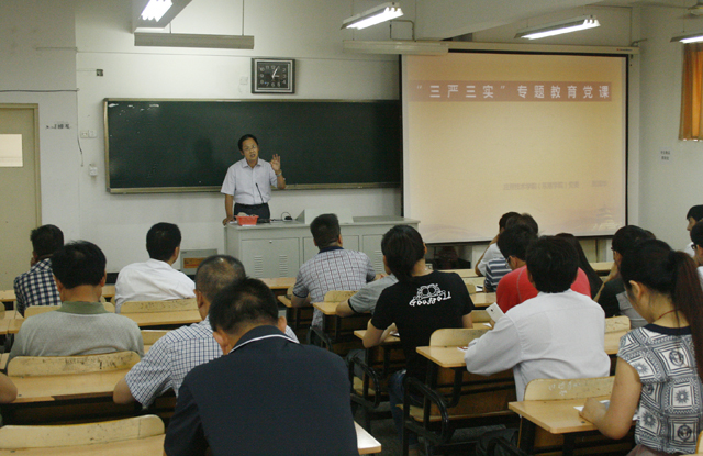 7月3日下午,应用技术学院党委举办“三严三实”专题党课教育活动。应用技术学院党委书记周清华作题为《开展“三严三实”专题教育 力推应用技术学院改革发展》的专题党课报告,应用技术学院全体教职工党员、学生党员代表参加会议。