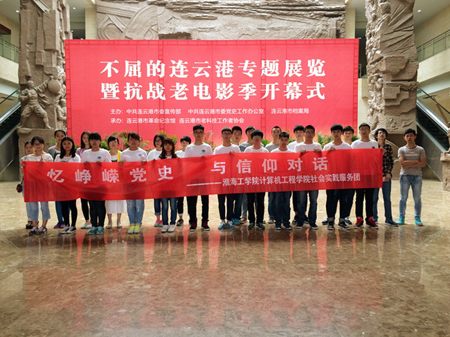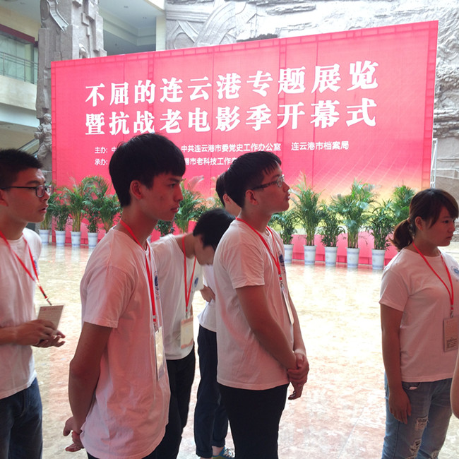 近日,连云港革命纪念馆联合中共连云港市市委宣传部、中共连云港市委党史工作办公室及连云港市档案局举行了“不屈的连云港专题展览”暨抗战电影季这一盛大活动。这一天清晨,一群人早早的来到纪念馆,开始在工作人员的带领下有序而快速地再一次熟悉展馆的参观顺序、路线以及公共设施等基本情况,他们就是来自淮海工学院计算机工程学院“忆峥嵘党史,与信仰对话”社会实践服务团的同学们。在学院辅导员杜捷的带领下,他们同革命纪念馆合作,作为场馆秩序引导和维护的志愿者,与纪念馆的工作人员一道,见证和服务于这一盛大活动的启动与开展。