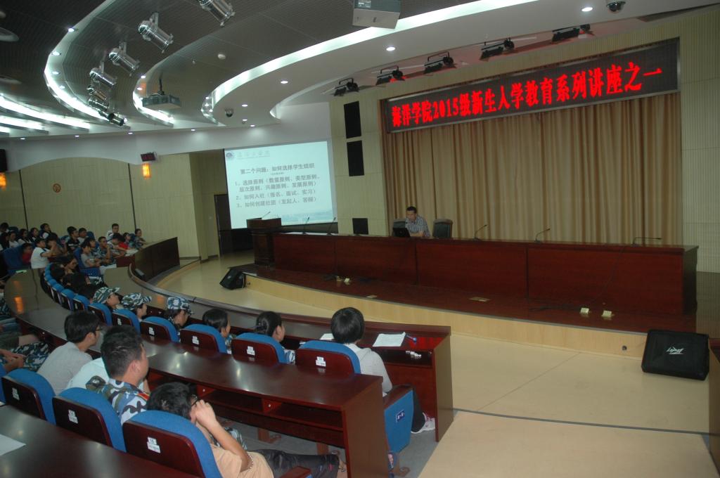 随后,马书记与15级新生互动交流,探讨了如何过好大学生生活,如何选择大学生社团。马书记首先从大学生的学习和生活状态着手,引导同学们对自己的大学生涯作出规划。作为大学生,学习和社团两者的重要性和平衡性。鼓励同学们在保证良好学习状态的情况下去参与多样的社团活动,锻炼能力,丰富自己的经历。马书记还就我校社团的大致情况做了简单的分析,列出了各类社团的名称和星级,方便同学们做出理性选择。讲座现场马书记幽默而不失庄重的语言,赢得了掌声连连。