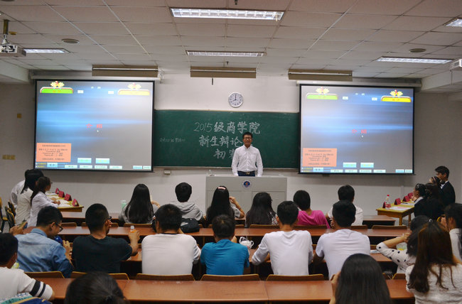 为了提高新生的思辨能力,锻炼思维表达能力以及丰富其课余生活,商学院举办了一年一度的新生辩论赛。初赛于9月25日晚6点30分在通灌校区报告厅举行。比赛共分为8场,2015级各班分场次进行对决。商学院辩论队主力以及学生会各部门副部长代表担任了本次辩论赛的评委。
