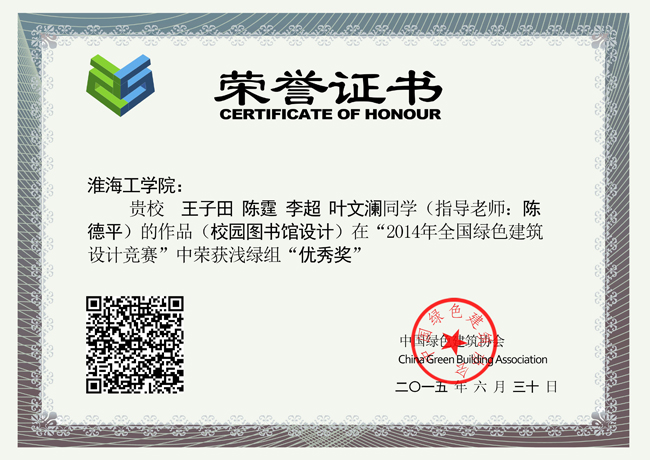 近日,2014年第五届“深绿设”全国绿色建筑设计竞赛成绩揭晓。我校土木工程学院建筑系张毅老师指导的姜柏宇同学不畏强手,获得深绿组三等奖(一等奖空缺,二等奖二名,三等奖六名;获奖总人数为8名,姜柏宇排名第6);陈德平老师指导的团队获得浅绿组优秀奖。