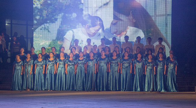 在接下来两个小时的时间里,学校各个社团百花齐放,在校学生、毕业校友各展风采,纷纷用自己擅长的方式表达了对母校的祝福。其中,海洋学院2003届毕业校友陈凯勇带来的独唱把全场气氛引到高潮,一首首经典老歌经过富有动感的伴奏改编,用不一样的方式释放人们心中的激情。在他演唱时天空中飘起了小雨,但是却丝毫没有影响现场师生的热情。晚会之中,还穿插着全体人员可以共同参与的摆手舞、竹竿舞等节目,每一个人跟随节奏,挥舞着手臂,笑着、唱着、跳着,在篝火旁尽情欢呼起舞。