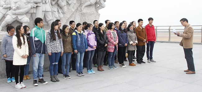 虽然天气冷凛,艺术学院党员们依旧认真聆听了沙东小学苏校长讲解的小沙东海战经过,被英烈们血染沙东的事迹深深震动,看着浮雕上的抗战人物,那一幕幕气壮山河的往事历历在目,党员们从内心感受到当今和平幸福生活的得来不易。随后,举行了重温入党誓词的仪式,在凛冽的海风中,辽阔的大海边,入党誓词又一次在回荡在大家的耳边,激发了大家勤奋工作、努力学习的决心。接着,教工党员代表王芳龙同志及学生党员代表侯佳钰同志作了发言。