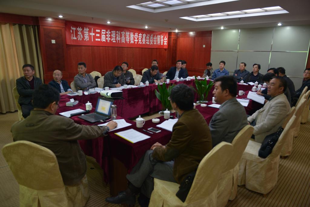 2015年11月上旬,第十三届江苏省普通高等学校高等数学竞赛组委会预备会在连云港市苏豪大酒店三楼会议室召开。江苏省高等学校数学教学研究会理事长、东南大学教务处副处长王栓宏教授,江苏省普通高等学校高等数学竞赛组委会主任南通大学郭跃华教授及竞赛组委会成员参加了会议,我校理学院王恒明书记、理学院史林兴副院长出席了预备会。会议由江苏省普通高等学校高等数学竞赛组委会主任南通大学郭跃华教授主持。