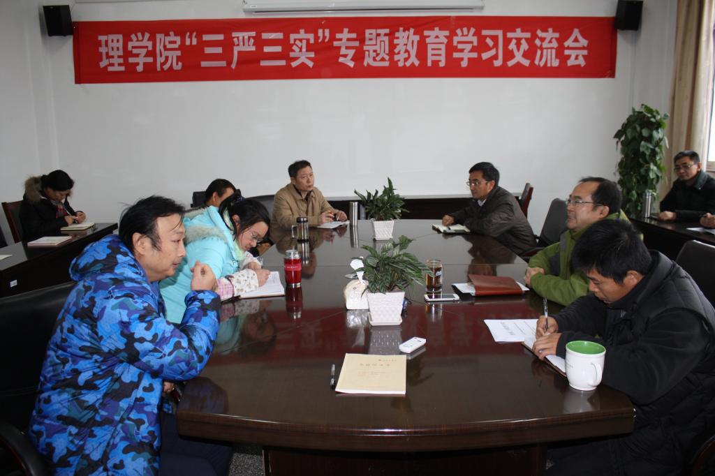 11月25日下午15:00,理学院领导班子“三严三实”专题教育第三专题学习研讨会在理学院会议室举行。研讨会由理学院党委书记王恒明做主题发言,理学院领导班子成员参加会议,各系主任、副主任、党支部书记及办公室人员列席会议。