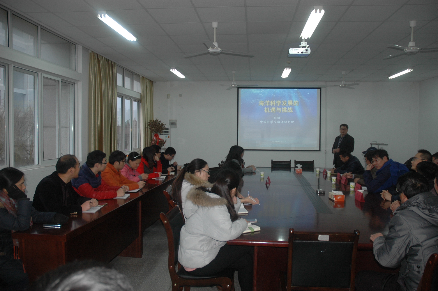 2015年12月22日下午,中国科学院海洋研究所孙松所长应海洋学院邀请,在海洋楼202会议室,以“海洋科学面临的机遇与挑战”为题作了精彩学术报告。孙所长在多个国内外重要学术组织任职,包括中国海洋研究委员会主席、中国海洋与湖沼学会理事长、国际海洋研究委员会(SCOR)副主席、国际海洋生物普查计划(CoML)科学指导委员会委员、中国委员会主席等。