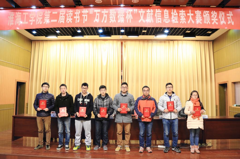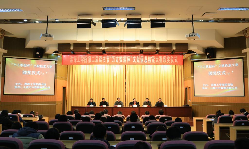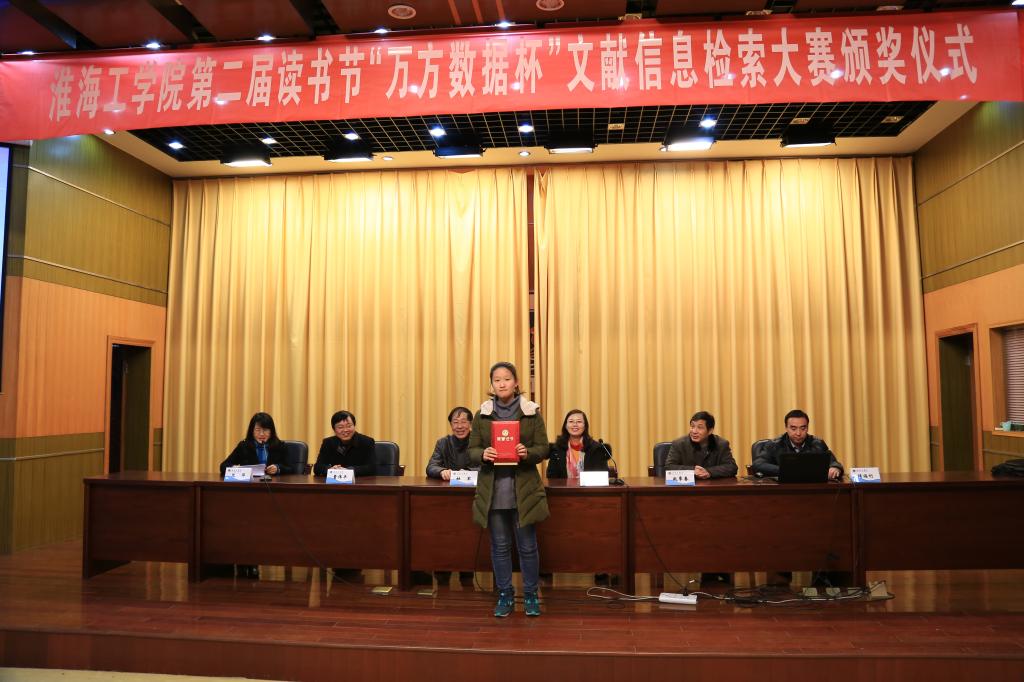 2015年12月23日下午,由淮海工学院图书馆主办,上海万方数据有限公司协办的“万方数据杯文献检索大赛”在学校讲堂楼报告厅举行了隆重的颁奖仪式。我校杜军副校长、上海万方数据有限公司的副总经理王亚楠女士亲临颁奖现场为获奖者颁奖。作为第二届读书节的重要活动之一,本次检索大赛得到了全校各学院的大力支持,共有162名师生积极参与,经过半个多月激烈的比拼,决出了特等奖1名,一等奖2名,二等奖4名,三等奖8名,及参与奖50名。本次活动极大地宣传了图书馆购买的数字资源,也调动了全校师生查文献、利用文献的热情。