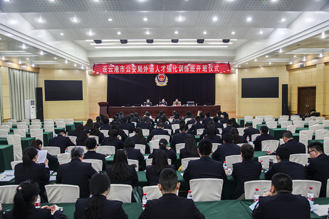 2016年3月14日晚,外国语学院(国际学院)与连云港市公安局举行了外语人才强化训练班开班仪式。外国语学院院长王聿良,市公安局党委委员、政治部主任鲁宏,外国语学院部分授课老师及76名参训民警参加了开班仪式。