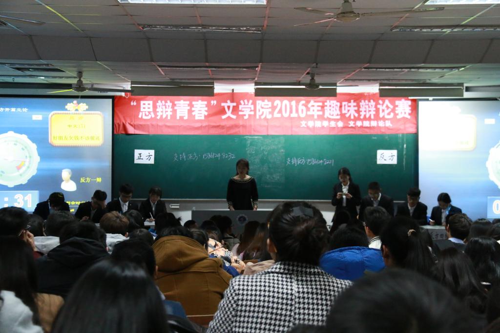 3月27日晚6点,文学院“思辩青春”新生趣味辩论赛在通灌校区TZ202教室精彩上演。文学院全体学生工作人员、2015级班主任及辩论队学生骨干成员参加了本次比赛并担任评委。