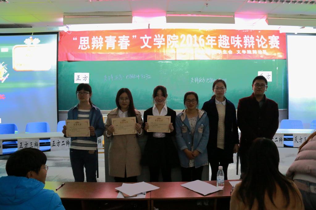 经过三场唇枪舌剑、趣味横生的辩论,新闻151荣获第一,广告151摘得第二,中文151名列第三。最佳辩手由中文152章轲楠、中文153王宇霞、广告151滕鹏程获得;中文151李宜瑾、新闻152陈楚旋、新闻151班王晓楠同时获得最具风采奖和人气辩手奖项。