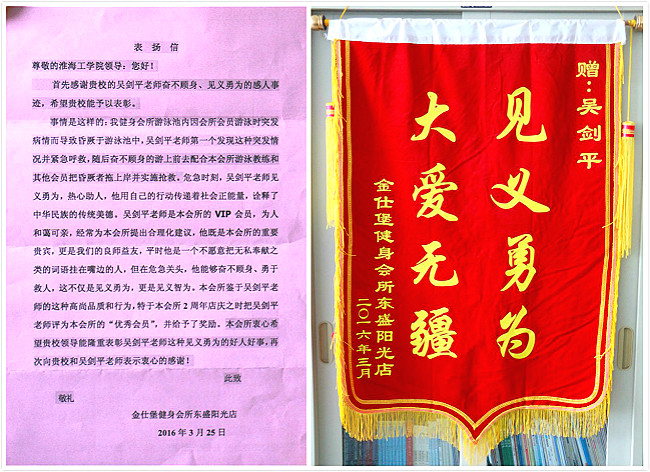 吴剑平老师平时是一个低调、淡定、内敛的人,他很少讲大话套话,但在危急关头,能够奋不顾身、见义勇为。事实上,这不仅是见义勇为,更是见义智为的壮举。感谢信的最后,金仕堡健身会所再次向淮海工学院和吴剑平老师表达了最衷心的感谢。