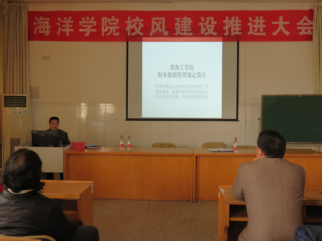 3月30日下午,海洋学院校风建设推进大会在海洋北楼会议室隆重举行,学院全体教职工参加了会议,大会邀请了校财务处事业核算科科长张舰同志对校财务管理有关制度及报销政策进行解读与辅导。会议由海洋学院院长阎斌伦主持。