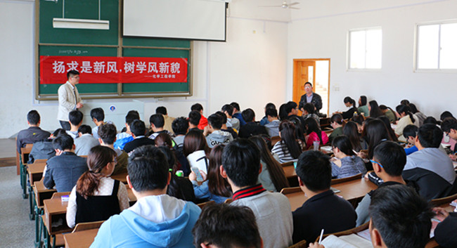 4月15日下午2点,化学工程学院优秀校友班鑫鑫博士的演讲报告会在第三教学楼B-102教室举行。本次报告会的主持人是副院长张东恩教授,参加本次会议的有高分子材料系的刘霖主任、研究生负责人贾海红老师和负责就业指导工作的王学梅老师。2014级化学工程与工艺、高分子材料专业百余名学生聆听了本次报告会。