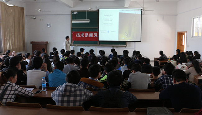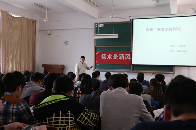 在演讲报告会上,班鑫鑫博士声情并茂地阐述了“坚持”的重要性,以自己的经历为例,讲述了坚持在学业、生活中对自己的影响,还幽默地提到了自己大四的恋爱经历,告诉同学们做事要自信、找准方向、坚持到底。班鑫鑫博士为大家放映图文并茂的PPT,建议大家找到类似马拉松长跑中的“幸福点”,在事情中设立一个个小目标去逐步完成。在“考研”这个大家最关注的话题上,班鑫鑫博士提出“要有更高的目标”,鼓励同学们以更高的标准要求自己,同时寻找志同道合的同学“组团”学习,互相监督,共同坚持。