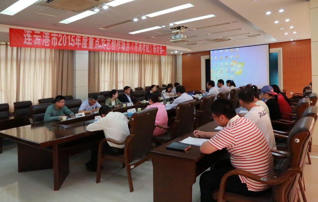 5月6日下午, 由应用技术学院申报的连云港市2015年度重点文艺创作项目”东海孝妇”研讨会在校文渊楼会议室召开。市委宣传部副部长杨浩、文艺处处长陈红、文艺处严高源、市文广新局艺术处处长杨冬梅、市艺术研究所所长助理、副研究员徐洪绕、校党委宣传部部长金芙蓉、副部长周锦忠、团委书记朱国军、副书记王琰、文学院教授伏涤修、应用技术学院党委书记周清华、副书记、副院长万金店及师生创作团队等出席。
