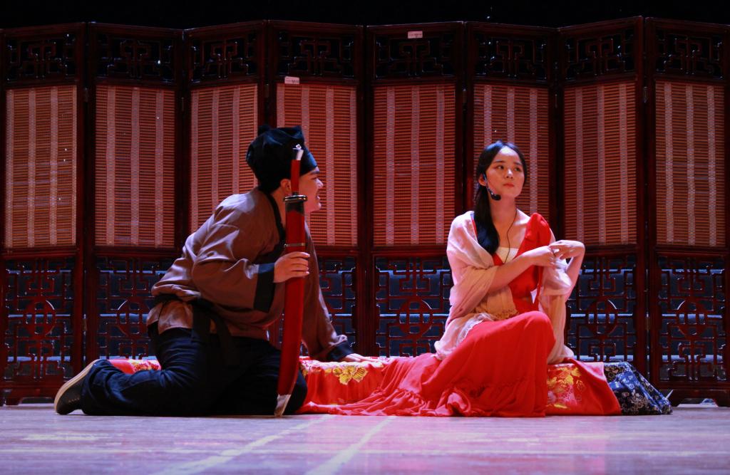 前音尚绕梁,后戏已开幕。第二场《我爱桃花》取材于冯梦龙《醒世恒言》,前戏表现了小衙县张婴醉酒回家,偶然撞见妻子和张燕偷情,张燕在慌乱躲藏中落下了巾帻。 “我要的是巾帻,你却给了我一把钢刀”, 张燕与张婴妻子由于会错意,最终张燕面临了杀谁的困境。后戏中三人在出戏状况下讨论到底要杀谁的矛盾与选择。全剧用寓言的形式演绎了一场“戏中戏”,演员们在古今间来回穿梭,台下观众纷纷表示“脑洞太大”,“太有穿越感了”。演员们独特的思维方式和表演形式让观众叹为观止。