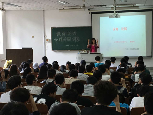 为活跃现场气氛,拉近与同学们之间的距离,解老师在讲座伊始与同学们共同观看了一组描绘大学生活的漫画,现场充满了欢声笑语,同时也引起了同学们对讲座的兴趣。接着解老师以“我过去…我现在…我将来…”为题让大家展开讨论,引发同学们深入思考,认识自我。同学们纷纷分享了自己的大学生活:从刚开始的满怀憧憬和亢奋状态到现在日趋冷静,有些同学对未来充满迷茫,有些同学一直为未来不懈地努力……大家意识到每个人在其成长期间都可能会出现不同的困惑,并由此产生一定的心理状态变化。其后,解老师向大家介绍了几例典型的大学生心理问题引发悲剧的实例,并教会大家从语言、行为、神态等多方面判断心理状态是否出现了失衡,让同学们要学会关注他人,他人的关心有可能会挽救一条生命。